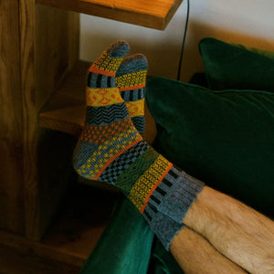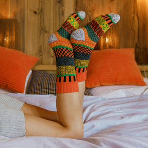 Don't worry about the cold when traveling the peaks far and wide. Our Svea sock set is the ideal colorful addition to your adventurer's kit. Thick and snug, they will keep your feet warm with style. Intricate checks, diamonds, and stripes in earthy tones will match any sweater.